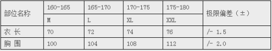 中國(guó)衛(wèi)生男、女式針織短袖T恤衫號(hào)型按GB/T 1335.1(男子)規(guī)定執(zhí)行。見(jiàn)下表規(guī)定: