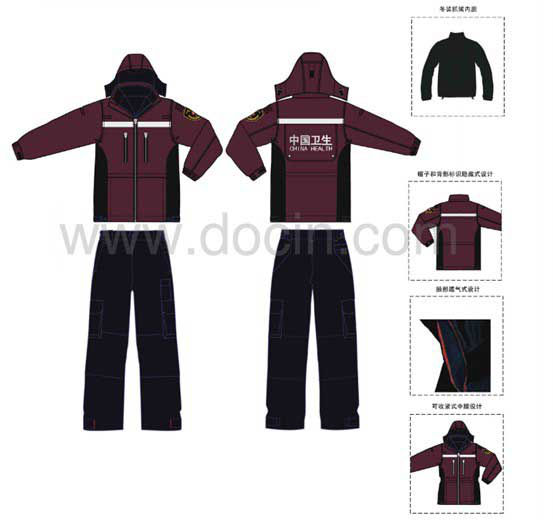 “中國衛(wèi)生應急服裝”是由冬裝/春秋裝、馬甲、夏裝、圓領衫、戶外帽、戶外靴、臂章等幾部分組成。