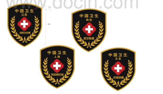 臂章正面中間位置印有“紅花白十字”,圖案上面兩行文字,***行是“中國衛(wèi)生”,第二行是承建單位或隊伍所在省份名稱;圖案下面一行文字說明隊伍的處置類別(如醫(yī)學救援等);兩側(cè)設計有環(huán)繞的麥穗圖案。