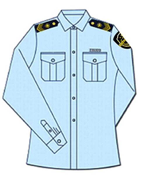 說明:襯衫為滌棉混紡面料,顏色為深藍色,短袖襯衫為小翻領(lǐng),單排四粒扣,兩個明口袋。長袖襯衫為豎領(lǐng),單排五???,兩個明口袋;西服簡褲或裙子為毛滌混紡面料。